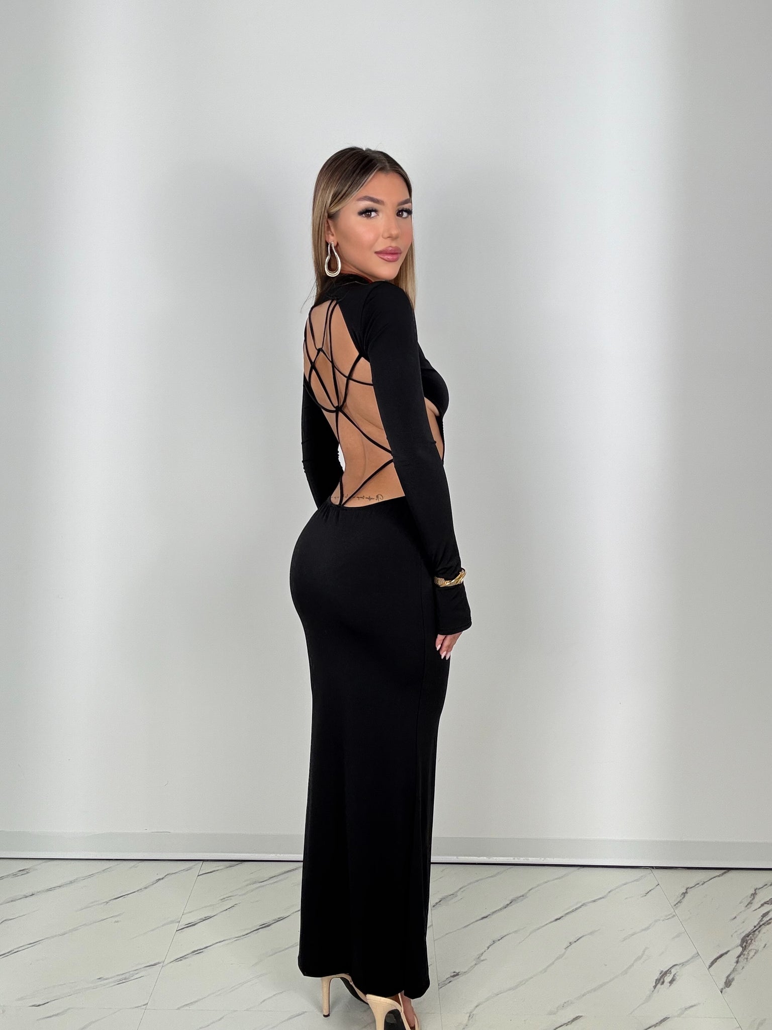 Abito lungo a manica lunga con schiena scoperta e intrecciata