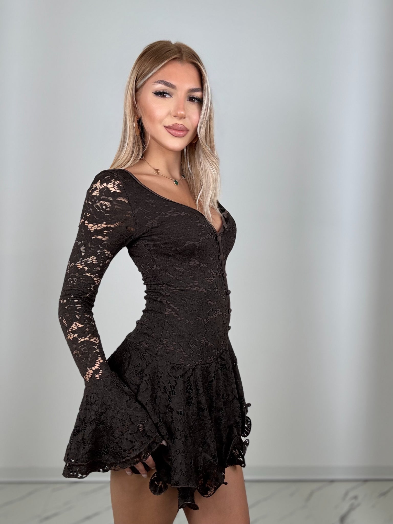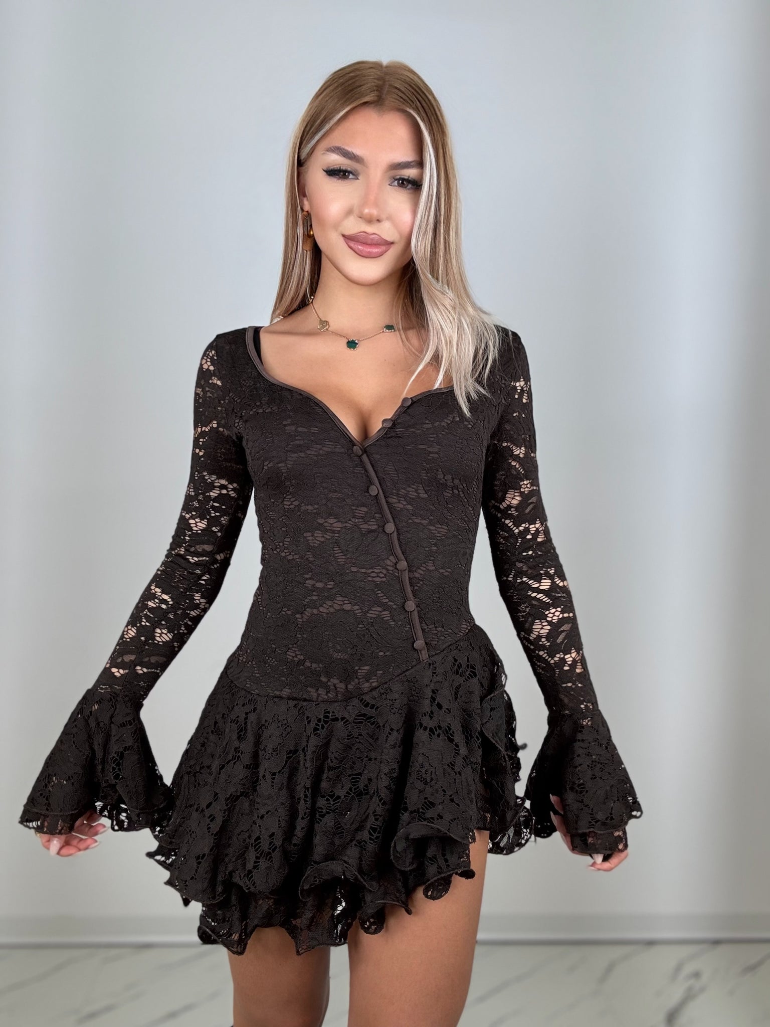 Abito in pizzo foderato con gonna a pantaloncini a balze asimmetrica tessuto sulle braccia trasparente elasticizzato