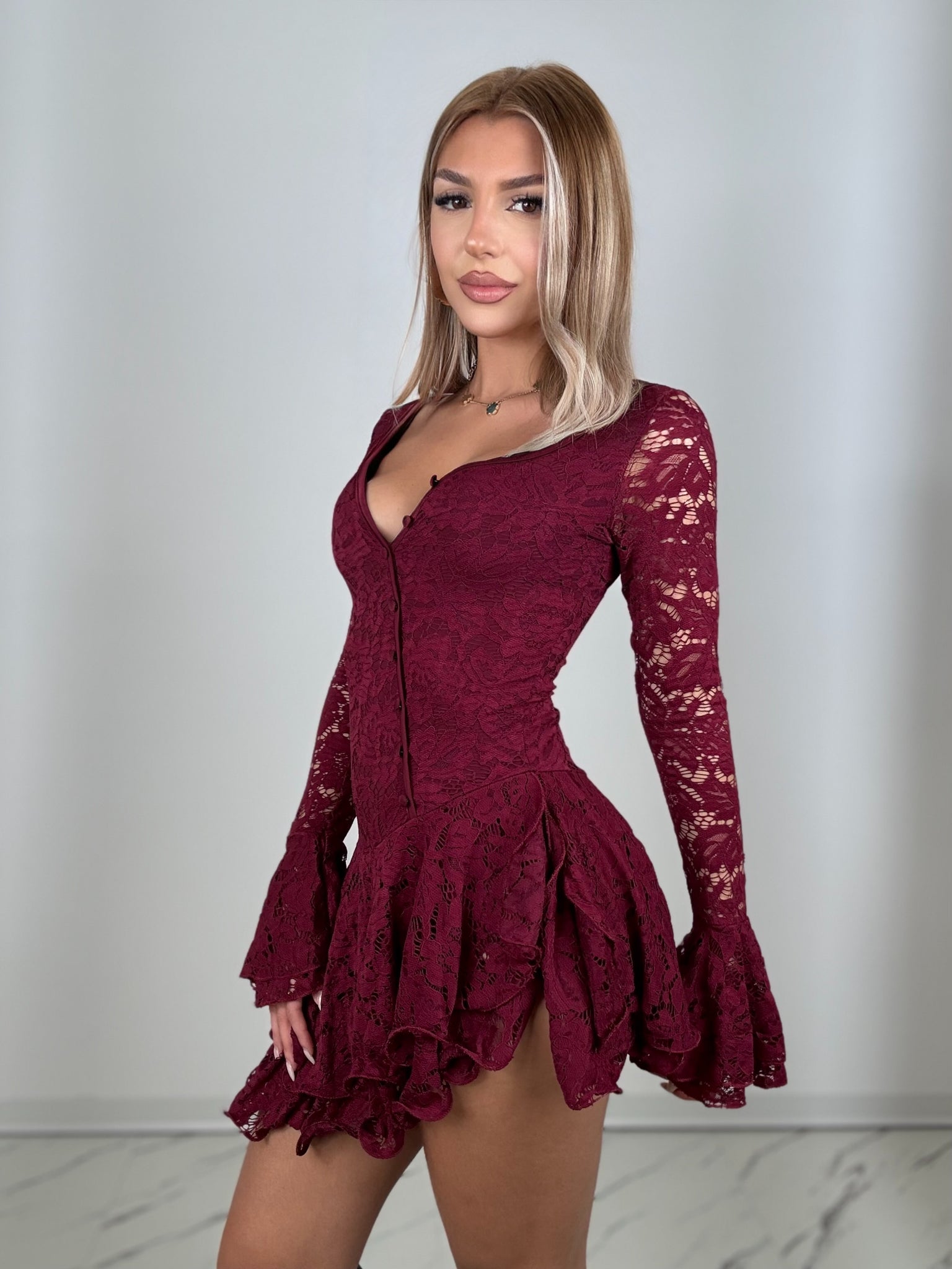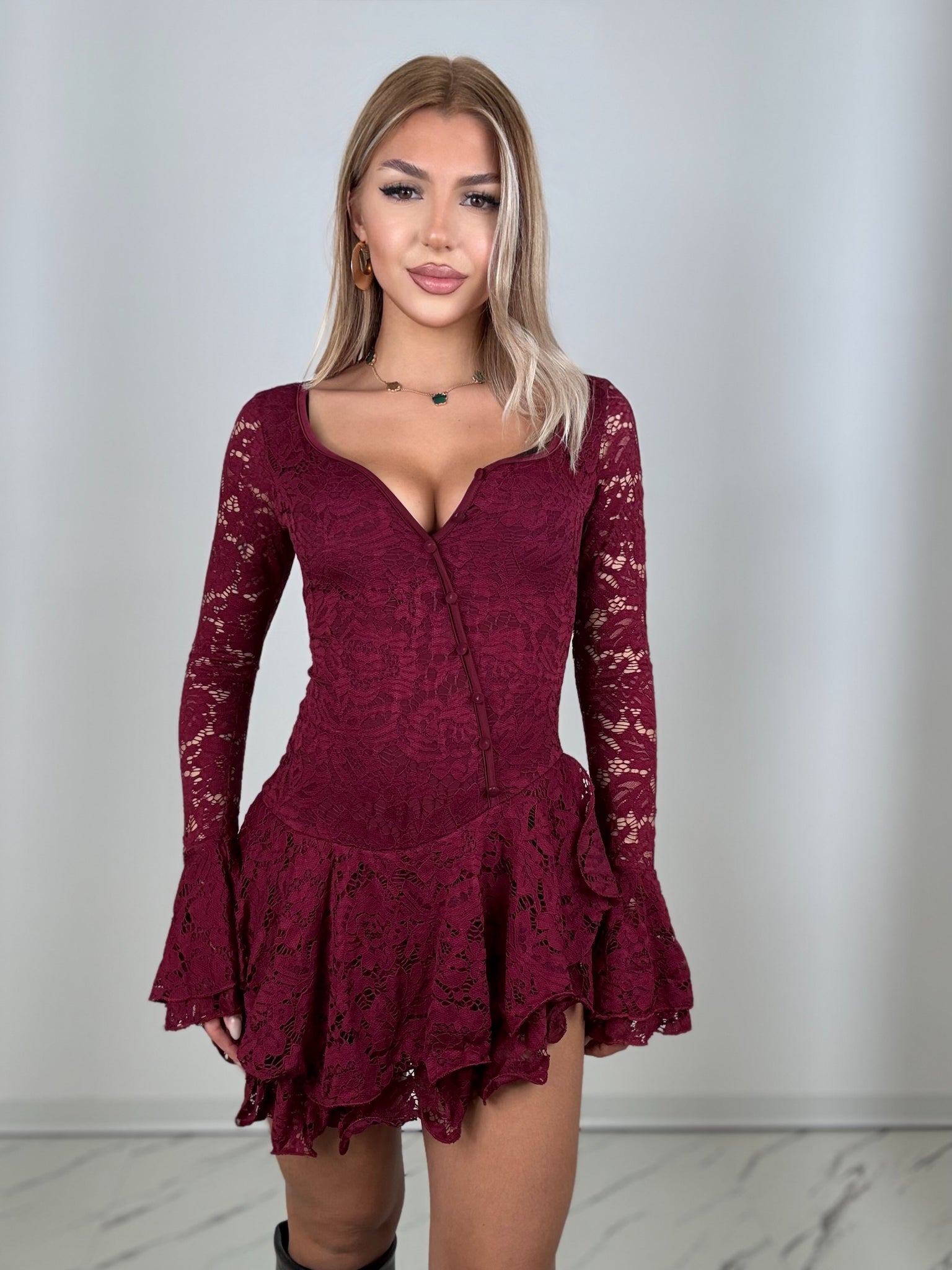 Abito in pizzo foderato con gonna a pantaloncini a balze asimmetrica tessuto sulle braccia trasparente elasticizzato